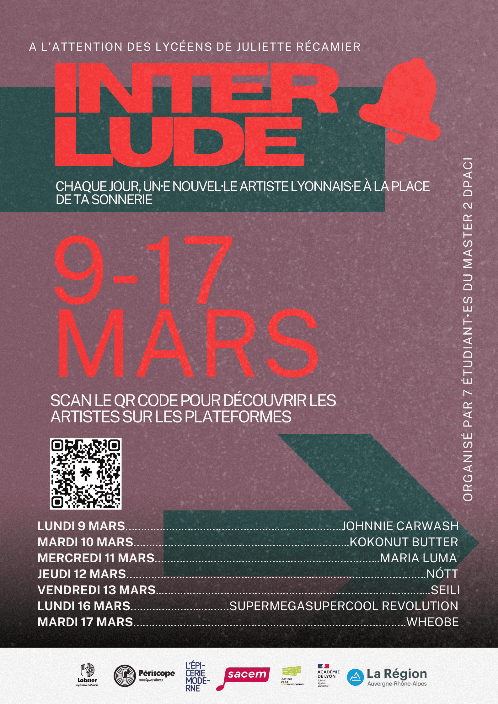 Du 2 au 17 mars, la sonnerie du lycée Récamier va changer pour laisser place aux musiques d’artistes émergeant.e.s de la région lyonnaise : Barkanan, Darwells, eat-girls, Emrode, Hôtel Particulier, Johnnie Carwash, Kokonut Butter, Maria Luma, Nótt, Seili, SuperMegaSuperCool Révolution, Wheobe.